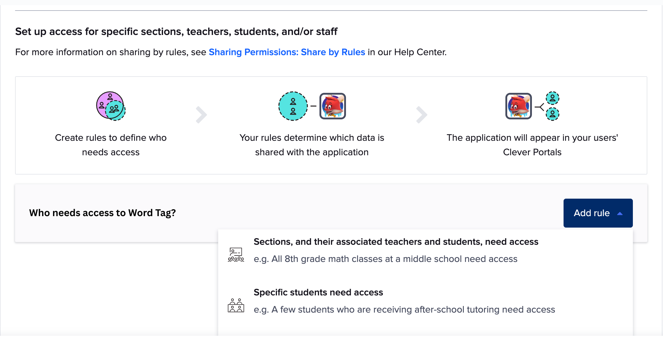 2I. Click ADD RULE to start adding sharing rules. You can share students' data with Word Tag by class, teacher, or individual student.