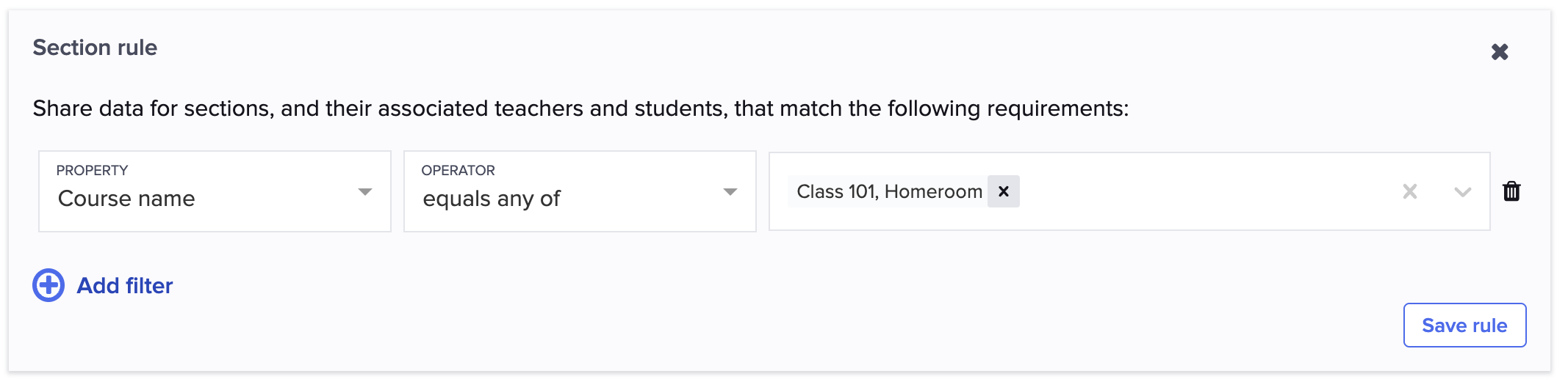2J. Share students' data by selecting their course name, teacher name, or student name. You can add as many rules as you need. Click SAVE RULE for each.